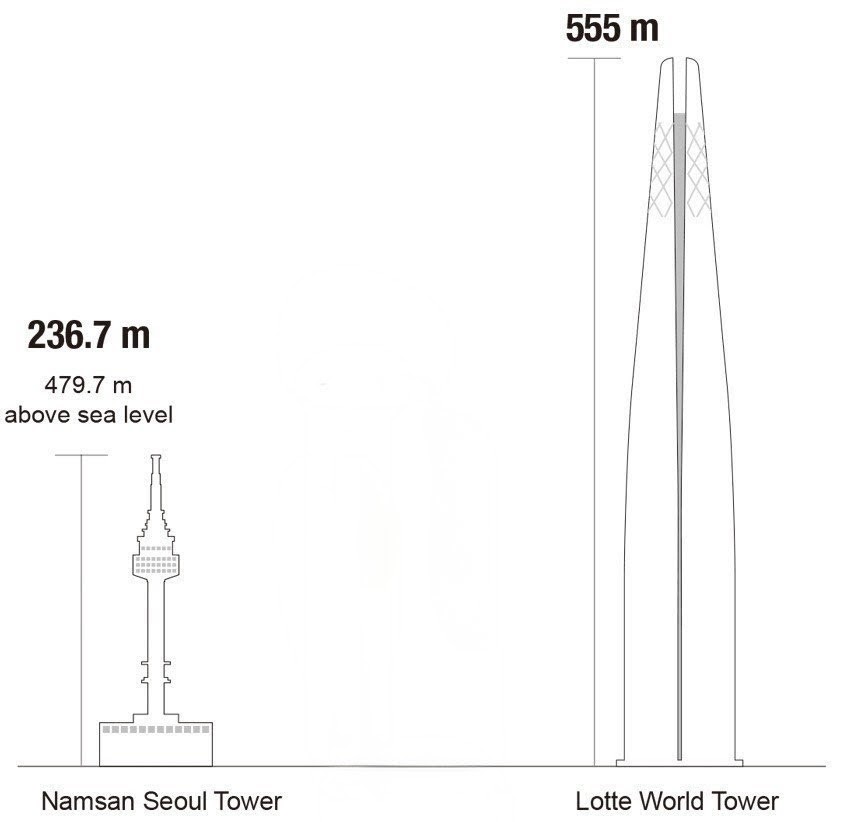 As you can see from the picture, the Lotte Tower is much taller than Namsan Tower, but the latter is perched on the summit of Namsan Mountain. As a result, their observation decks are at almost the same elevation.