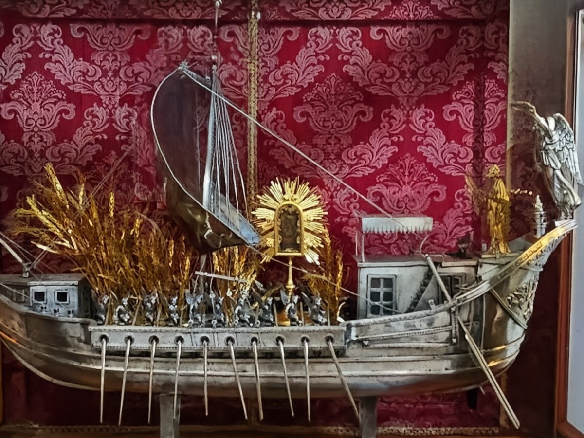 To commemorate this event, a silver reliquary was made in the shape of a 17th-century galleon. Created from 30kg / 66lb of silver and 2kg / 4.4lb of gold, it holds a small piece of skin, believed to belong to St. Bartholomew.