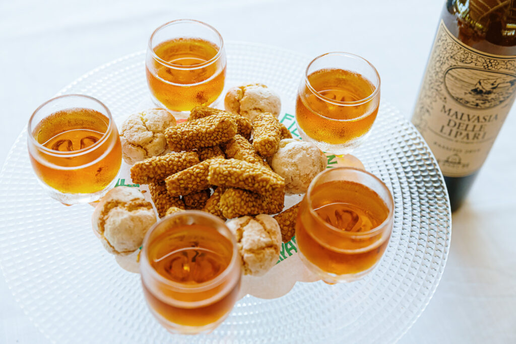 Known as the “Nectar of the Gods,” Malvasia delle Lipari is honey-sweet and is enjoyed at the end of a meal, often accompanied by piparelle (almond biscuits) or sesamini (sesame cookies).