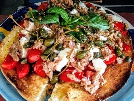 One is “Pane Cunzato.” It is a toasted flatbread topped with all kinds of local products including tomatoes, salted ricotta cheese, olives, anchovies, tuna, and, of course, a generous amount of capers.